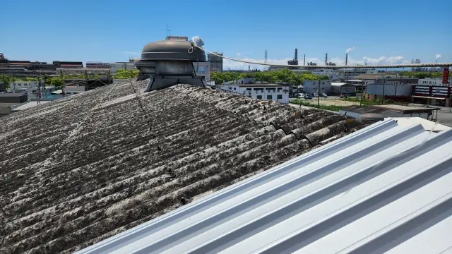 カバー工法:既存のスレート屋根(20kg/㎡)の上に新しいガルバリウム鋼板(5kg/㎡)を重ねた場合、屋根全体の重量は25kg/㎡となり、100㎡で約500kgの重量増加となります。